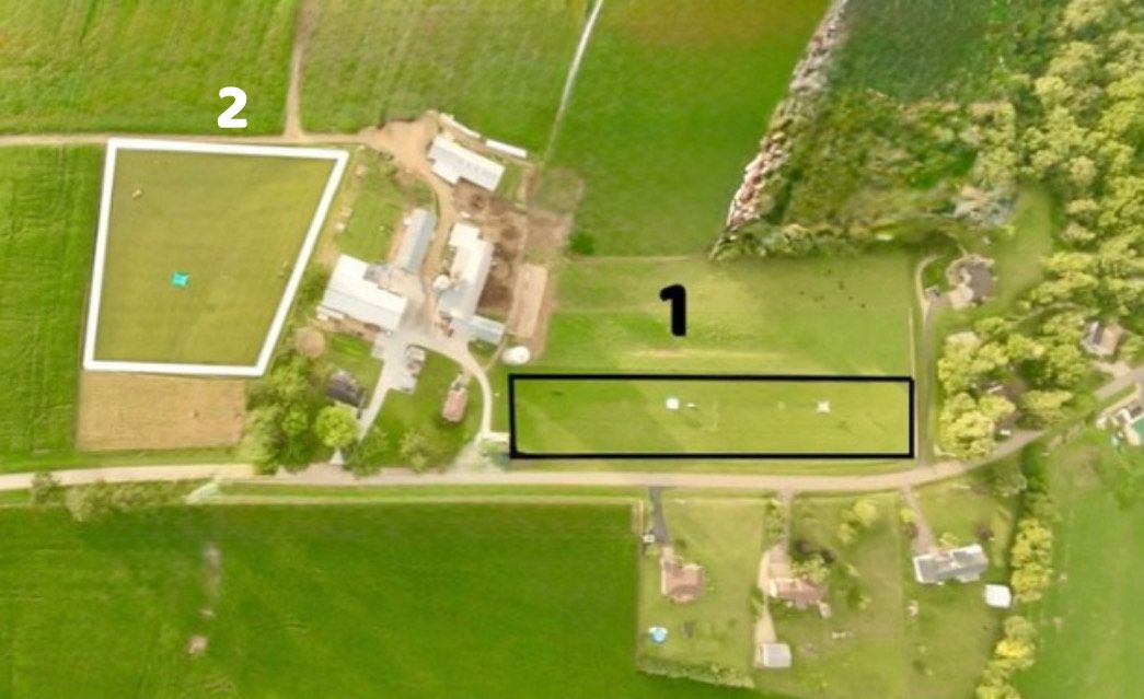 Your GPS will bring you to Dog Park 1, shown on the right in this overview photo. Dog Park 2 is located two driveways down from Dog Park 1 — on the right if you’re coming from Verona (west), or the first driveway on the left if you’re coming from Mt. Horeb (east). Look for the red signs marked “1” and “2” to guide you to the correct park for your reservation.